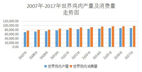 近年來,雞肉產(chǎn)量、銷量呈快速上升趨勢。根據(jù)wind統(tǒng)計(jì)數(shù)據(jù),世界雞肉生產(chǎn)量保持穩(wěn)定增長,從2007年的69447千噸,增長到2017年6月的89470千噸,世界雞肉消費(fèi)量從2007年的76487千噸,增長到2017年6月的98771千噸。