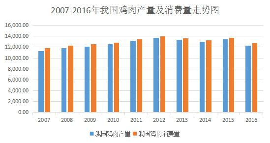 從2007年開始,受H7N9疫情和成本快速上升等因素的困擾,中國雞肉生產(chǎn)進(jìn)入了平穩(wěn)發(fā)展時(shí)期,雖然增長速度有所減緩,但是增長趨勢依然強(qiáng)勁。2007年至2012年,我國雞肉年產(chǎn)量及消費(fèi)量持續(xù)增長,2013年以來受疫情、中央八項(xiàng)規(guī)定等因素的影響,雞肉年產(chǎn)銷量略有下降,但始終保持在1,300萬噸以上的水平。雞肉產(chǎn)量從2007年的11291千噸增長至2016年的12300千噸,雞肉消費(fèi)量從2007年的11773千噸增長至2016年的12730千噸。