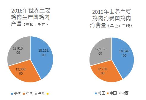 從地區(qū)分布上看,世界前三大雞肉生產(chǎn)和消費(fèi)國家為美國、中國和巴西。美國為世界雞肉第一大生產(chǎn)國。根據(jù)wind數(shù)據(jù)統(tǒng)計(jì),2016年,美國雞肉生產(chǎn)量達(dá)18261千噸;中國雞肉生產(chǎn)量達(dá)12300千噸;巴西雞肉生產(chǎn)量達(dá)12910千噸。2016年,美國、中國和巴西的雞肉消費(fèi)量分別為18346千噸、12730千噸和12913千噸。