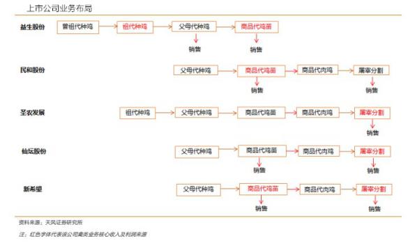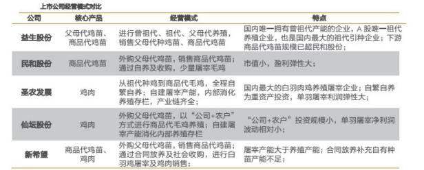 從2010年益生股份上市之后,A股就已經(jīng)有了完整了白羽肉雞產(chǎn)業(yè)鏈。目前共有5家上市公司——民和股份、益生股份、圣農(nóng)發(fā)展、仙壇股份、新希望——擁有相關(guān)業(yè)務(wù)。各家的側(cè)重點(diǎn)略有不同。