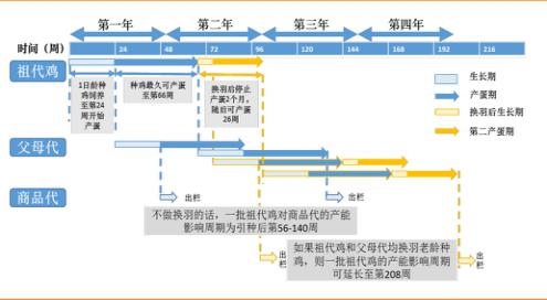 理論上,從1日齡祖代引種到商品代毛雞出欄,共需約15-16個(gè)月。具體而言: