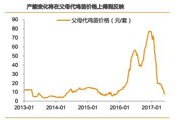 引種規(guī)模的下降意味著祖代存欄的下降,供給的減少將導(dǎo)致父母代雞苗銷售價(jià)格下降。由于2012年以前國內(nèi)白羽肉雞需求快速增加,因此,國內(nèi)白羽雞引種規(guī)增速的下降也會(huì)引起價(jià)格的上漲。例如,2010年的引種規(guī)模與2009年基本持平,僅增長3萬套。受此影響,父母代雞苗價(jià)格也從2010年9月份開始反彈。同樣的,隨著2014年引種規(guī)模的下降,父母代雞苗價(jià)格則從2014年3月見底回升,中間雖有波動(dòng),但從2015年10月即開始一輪快速上漲。也就是說,對于祖代產(chǎn)能的變化,父母代雞苗價(jià)格是一個(gè)重要的驗(yàn)證指標(biāo)。