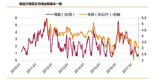理論上,在產(chǎn)父母代存欄的變動(dòng),3周后將傳導(dǎo)到雞苗環(huán)節(jié)。但實(shí)際上,由于商品代離消費(fèi)者最近,需求端的影響要大于供給端的影響。從數(shù)據(jù)上看,雖然商品代雞苗由于沒有庫存,產(chǎn)品價(jià)格波動(dòng)幅度遠(yuǎn)大于毛雞價(jià)格的波動(dòng)幅度,但是兩者之間的走勢卻基本一致,間隔最多不會(huì)超過1周。因此,判斷毛雞價(jià)格走勢基本等價(jià)于判斷雞苗價(jià)格。