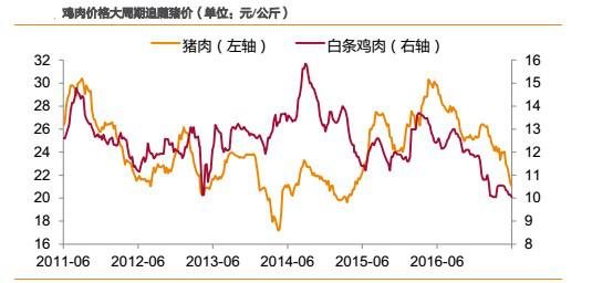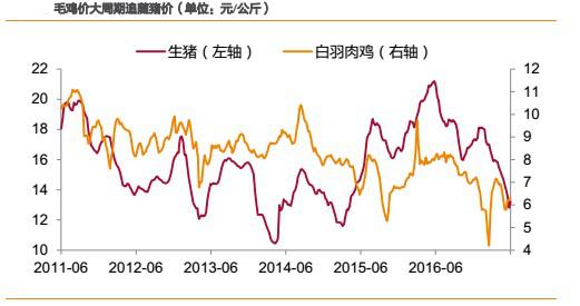2)短周期內(nèi),受各自供求關(guān)系決定產(chǎn)品價(jià)格,則豬價(jià)、雞價(jià)走勢有可能會(huì)發(fā)生背離,但背離時(shí)間一般不會(huì)超過1個(gè)季度,且背離的時(shí)間一般出現(xiàn)在春節(jié)后的上半年。如2012年2月-4月,2014年2月-4月、2015 年3月-6月、2016年3月-6月、2017年2月-3月。