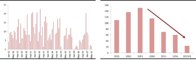 2015年以來,祖代雞引種在持續(xù)收縮過程中,總量上基本得到了控制。美國、法國、西班牙等重要引種來源國相繼被封關(guān),目前可以引種的國家十分有限。2017年上半年各品種共引進(jìn)23萬套,比去年同期多出12萬套,主要是集中在今年1/2月份。