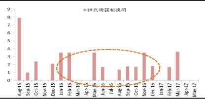 祖代場強(qiáng)制換羽主要集中在 16 年