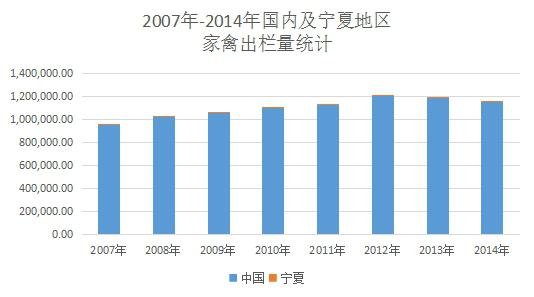 依據(jù)wind數(shù)據(jù),2014年全國家禽出欄量1154167.1萬只,寧夏地區(qū)家禽出欄量達(dá)1204.4萬只,占全國出欄量的0.1%。自2007年以來,寧夏地區(qū)的家禽出欄量一直以0.1%~0.12%的全國占比,市場占比非常小。