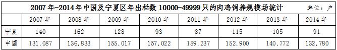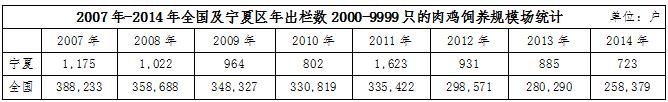 不僅如此,在肉雞飼養(yǎng)場的規(guī)模上也有明顯的差距。據(jù)wind數(shù)據(jù)統(tǒng)計(jì),2014年,寧夏區(qū)內(nèi)肉雞年出欄數(shù)在1-1999只的肉雞飼養(yǎng)規(guī)模場戶數(shù)為133734戶,當(dāng)年全國同規(guī)模的飼養(yǎng)場戶數(shù)高達(dá)21644679戶,占比為0.62%;年出欄數(shù)在2000-9999只的肉雞飼養(yǎng)規(guī)模戶數(shù),寧夏地區(qū)為723戶,全國為258379戶,占比0.28%;年出欄數(shù)在10000-49999只的肉雞飼養(yǎng)規(guī)模戶數(shù),寧夏地區(qū)為91戶,全國為132780戶,占比為0.07%。