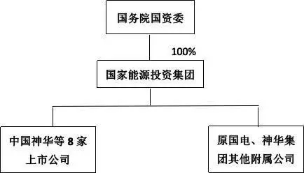 在神華集團與國電集團吸收合并前,國務(wù)院國資委分別持有國電集團、神華集團100%股權(quán)。吸收合并完成之后,國務(wù)院國資委持有國家能源投資集團100%股權(quán)。如圖所示:
