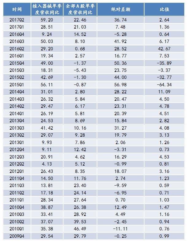 根據(jù)與全部A股營(yíng)收相比較,在2012年之前,植入器械的營(yíng)收總體上與全部A股的保持一致。2012年之后,全部A股的營(yíng)收變動(dòng)相對(duì)平緩;而植入器械行業(yè)營(yíng)收基本高于全部A股營(yíng)收,在2016年經(jīng)歷谷值之后,行業(yè)保持增長(zhǎng)的趨勢(shì)。