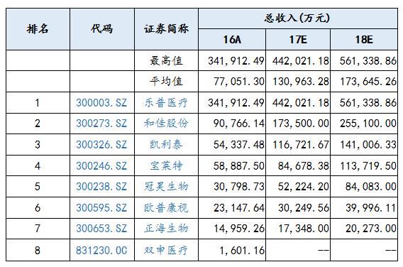 通過(guò)對(duì)植入器械上市公司的盈利做出預(yù)測(cè),上市公司總收入的平均值在2017年、2018年預(yù)計(jì)分別是130,963.28萬(wàn)元、173,645.26萬(wàn)元,相對(duì)于2016年的77,051.30萬(wàn)元,呈現(xiàn)逐年增長(zhǎng)的趨勢(shì);其上市公司盈利最高值預(yù)測(cè)值在2017年、2018年分別達(dá)到442,021.18萬(wàn)元、561,338.86,相較于2016年的341,912.49萬(wàn)元,呈現(xiàn)逐年增長(zhǎng)的趨勢(shì),市場(chǎng)總體看好植入器械上市公司。