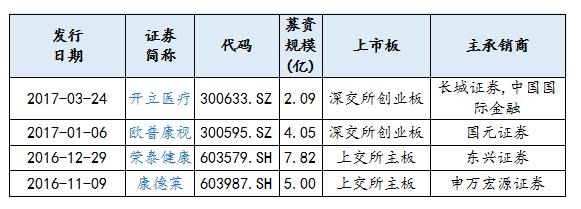 從2016年8月17日至2017年8月17日,植入器械行業(yè)上市公司股權(quán)融資主要有開(kāi)立醫(yī)療、歐普康視、榮泰健康、康德萊,分別是深交所創(chuàng)業(yè)板、上交所主板的上市公司,通過(guò)IPO方式融資,募資規(guī)模分別為2.09億元、4.05億元、7.82億元、5.00億元。