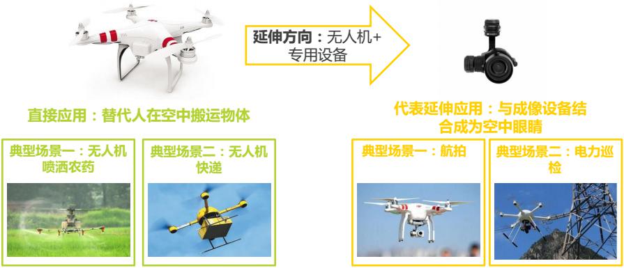 無人機(jī)價(jià)值在于替代人類完成空中作業(yè),并且能夠形成空中平臺(tái),結(jié)合其他部件擴(kuò)展應(yīng)用。