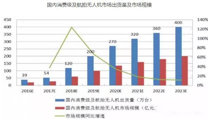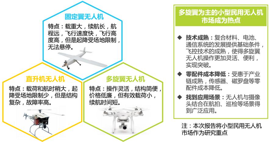 隨著技術(shù)成熟,零配件成本降低,并且開發(fā)了航拍、電力巡檢等應(yīng)用場(chǎng)景,以多旋翼無人機(jī)為主的小型民用無人機(jī)市場(chǎng)成為熱點(diǎn)。