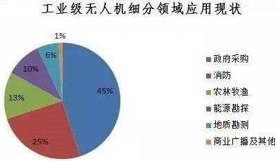 目前,工業(yè)級(jí)無人機(jī)細(xì)分領(lǐng)域中,政府采購(gòu)占比45%,消防占比25%,農(nóng)林牧漁占比13%,能源勘探占比10%,地質(zhì)勘測(cè)占比6%,商業(yè)廣播及其他占比1%。