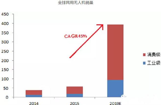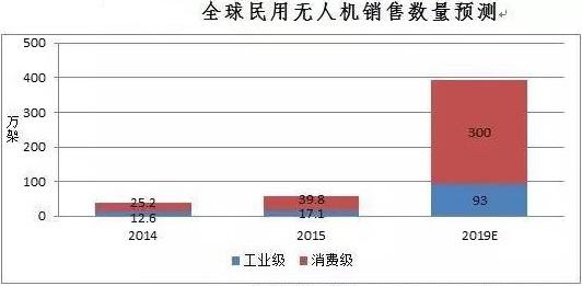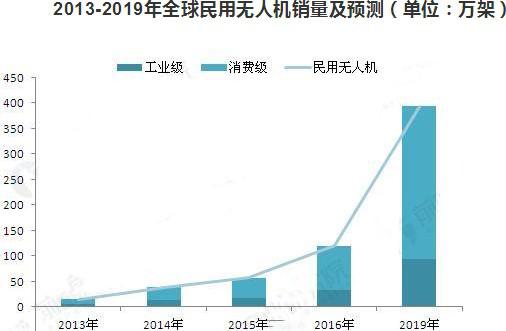 全球民用無人機(jī)在2014年迎來大約37.8萬架的銷量,其中工業(yè)級(jí)無人機(jī)銷量約12.6萬架,消費(fèi)級(jí)無人機(jī)銷量約25.2萬架。在2015年大約銷售民用無人機(jī)56.9萬架,其中,工業(yè)級(jí)無人機(jī)銷量約17.1萬架,消費(fèi)級(jí)無人機(jī)銷量約39.8萬架。IDC預(yù)測(cè),到2019年全球無人機(jī)年銷量將達(dá)到393萬架,其中消費(fèi)級(jí)300萬臺(tái),CAGR達(dá)到60%;工業(yè)級(jí)無人機(jī)銷量為93萬臺(tái),CAGR達(dá)到45%。