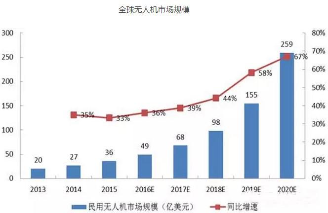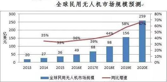 2015年,全球民用無人機(jī)市場(chǎng)規(guī)模為36億美元,同比增長(zhǎng)33%。據(jù)中國(guó)產(chǎn)業(yè)信息網(wǎng)預(yù)測(cè),到2020年全球民用無人機(jī)市場(chǎng)規(guī)模預(yù)計(jì)可達(dá)259億美元,年均復(fù)合增長(zhǎng)率為42%。