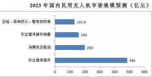 預(yù)計(jì)到2023年,我國(guó)民用無人機(jī)各細(xì)分應(yīng)用領(lǐng)域的市場(chǎng)份額分別為:消費(fèi)級(jí)及航拍無人機(jī)市場(chǎng)200億元,農(nóng)業(yè)植保硬件銷售160億元,農(nóng)業(yè)植保服務(wù)485億元,巡檢、森林防火、警用安防等領(lǐng)域共計(jì)131.9億元,合計(jì)976.9億元。