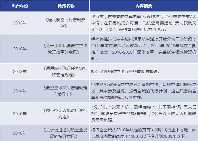 我國(guó)對(duì)低空空域的監(jiān)管十分嚴(yán)格,無人機(jī)屬于民航的一個(gè)分支,無人機(jī)市場(chǎng)的發(fā)展與國(guó)務(wù)院、中央軍委空中交通管制委員會(huì)和中國(guó)民航局的相關(guān)政策規(guī)定密切相關(guān)。