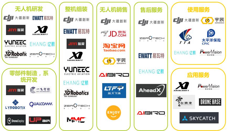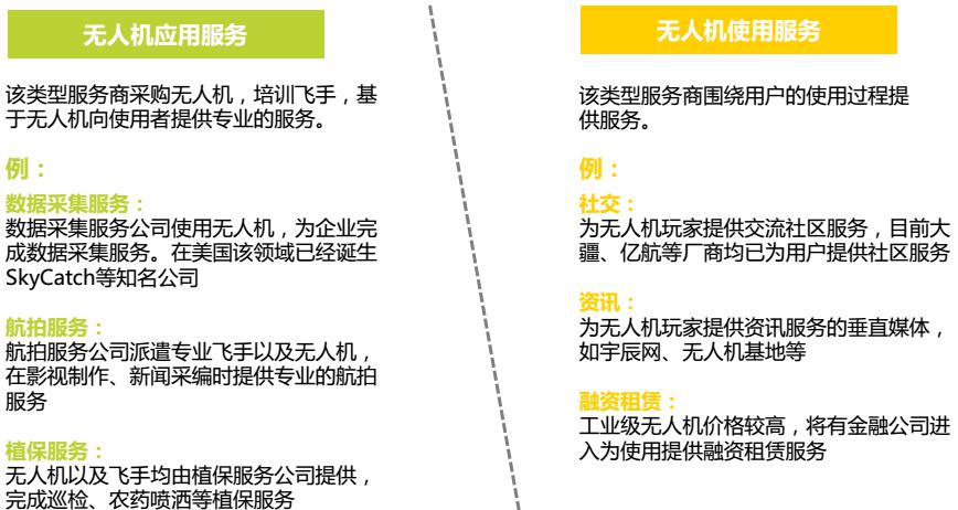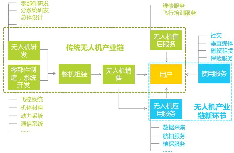 無人機(jī)產(chǎn)業(yè)鏈除了傳統(tǒng)的生產(chǎn)制造環(huán)節(jié)外,還出現(xiàn)了針對(duì)用戶使用過程的社交、保險(xiǎn)以及數(shù)據(jù)采集、航拍等基于應(yīng)用場(chǎng)景的產(chǎn)業(yè)服務(wù)。