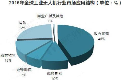 從應(yīng)用結(jié)構(gòu)來看,當(dāng)前全球工業(yè)無人機(jī)行業(yè)中45%為政府采購(gòu),能源勘探和地球勘探的應(yīng)用占比分別為10%和6%,農(nóng)林牧漁的應(yīng)用占比約為13%,在消防領(lǐng)域的應(yīng)用占比達(dá)到25%。