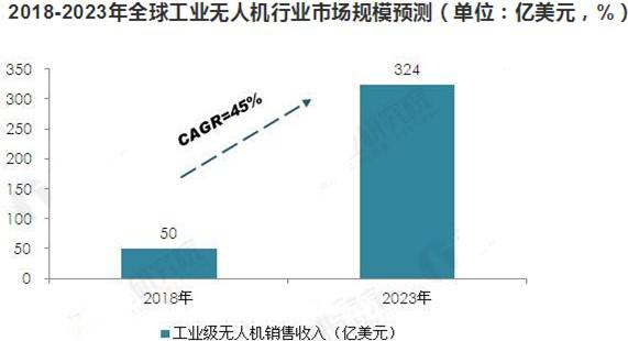 隨著工業(yè)級(jí)無人機(jī)技術(shù)的不斷發(fā)展,未來工業(yè)級(jí)無人機(jī)將呈爆發(fā)式增長(zhǎng)。結(jié)合國(guó)際權(quán)威機(jī)構(gòu)對(duì)未來工業(yè)級(jí)無人機(jī)行業(yè)發(fā)展趨勢(shì)的判斷,預(yù)計(jì)到2023年,全球工業(yè)級(jí)無人機(jī)市場(chǎng)規(guī)模將超過300億美元。2018-2023年行業(yè)年均復(fù)合增長(zhǎng)率將維持在45%左右。