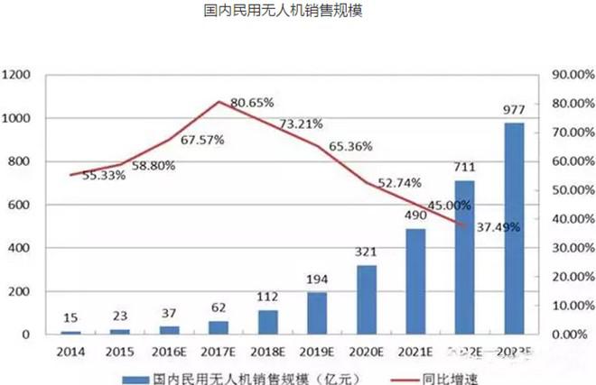 2014年國(guó)內(nèi)民用無人機(jī)產(chǎn)品銷售規(guī)模15億元,2015年銷售規(guī)模23.3億元,同比增長(zhǎng)55.3%。據(jù)IDC數(shù)據(jù)預(yù)測(cè),2019年中國(guó)民用無人機(jī)市場(chǎng)銷售規(guī)模達(dá)到390萬臺(tái),合計(jì)約600億元。預(yù)計(jì)到2023年,國(guó)內(nèi)民用無人機(jī)市場(chǎng)規(guī)模將會(huì)達(dá)到976.9億元,年復(fù)合增長(zhǎng)率59%。