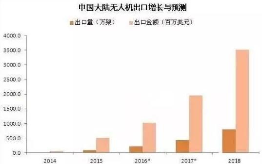 據(jù)國(guó)家海關(guān)數(shù)據(jù)統(tǒng)計(jì),2015年中國(guó)大陸出口無人機(jī)89.1萬架,同比增長(zhǎng)427.2%;出口金額5.15億美元(約合32.7億人民幣),同比增長(zhǎng)730.6%。主要出口地區(qū)依次是香港、北美和歐盟,平均出口價(jià)折合人民幣約3670元。其中,出口香港的40%又轉(zhuǎn)銷到北美和歐盟。2015年中國(guó)大陸進(jìn)口無人機(jī)14.5萬架,同比增長(zhǎng)1350%;進(jìn)口金額1.1億美元,同比增長(zhǎng)83.3%。平均進(jìn)口價(jià)折合人民幣約4817元。目前中國(guó)大約有400個(gè)無人機(jī)制造商,是全球70%的無人機(jī)需求市場(chǎng)的供貨商。
