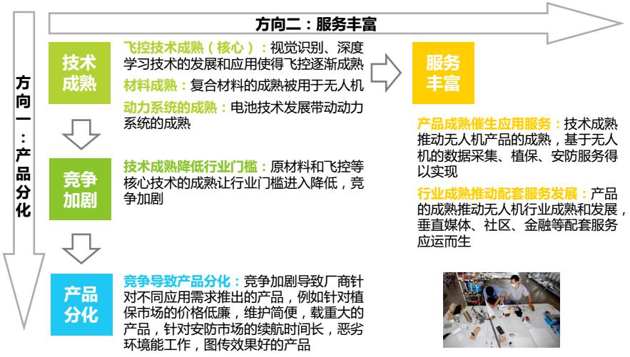 無人機(jī)技術(shù)成熟降低了行業(yè)門檻,使得行業(yè)競(jìng)爭(zhēng)加劇,產(chǎn)品出現(xiàn)分化,技術(shù)和產(chǎn)品的成熟也使得應(yīng)用和配套服務(wù)越發(fā)豐富。