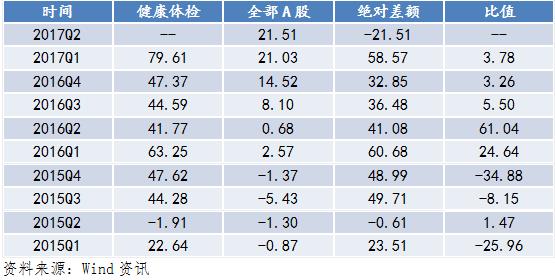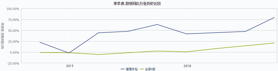 根據(jù)圖1數(shù)據(jù)顯示,從2015年第一季度到2017年第二季度,與全部A股相比,健康體檢行業(yè)的單季度營收同比總體處于較高水平,并表現(xiàn)為波動增長的趨勢。