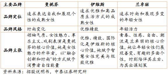 公司實(shí)行多品牌運(yùn)作戰(zhàn)略,針對不同年齡段和不同風(fēng)格的消費(fèi)者推出三個(gè)中高端核心品牌“曼妮芬”、 “伊維斯”和“蘭卓麗”,三個(gè)副牌COYEEE、Bodybeauty 和喬百仕。其中,主打品牌“曼妮芬”連續(xù) 12 年市占率第一,其市占率長期領(lǐng)先于規(guī)模最大的內(nèi)衣公司安莉芳的主品牌“安莉芳”。第二大品牌“伊維斯”連續(xù)兩年市場份額排名前十。